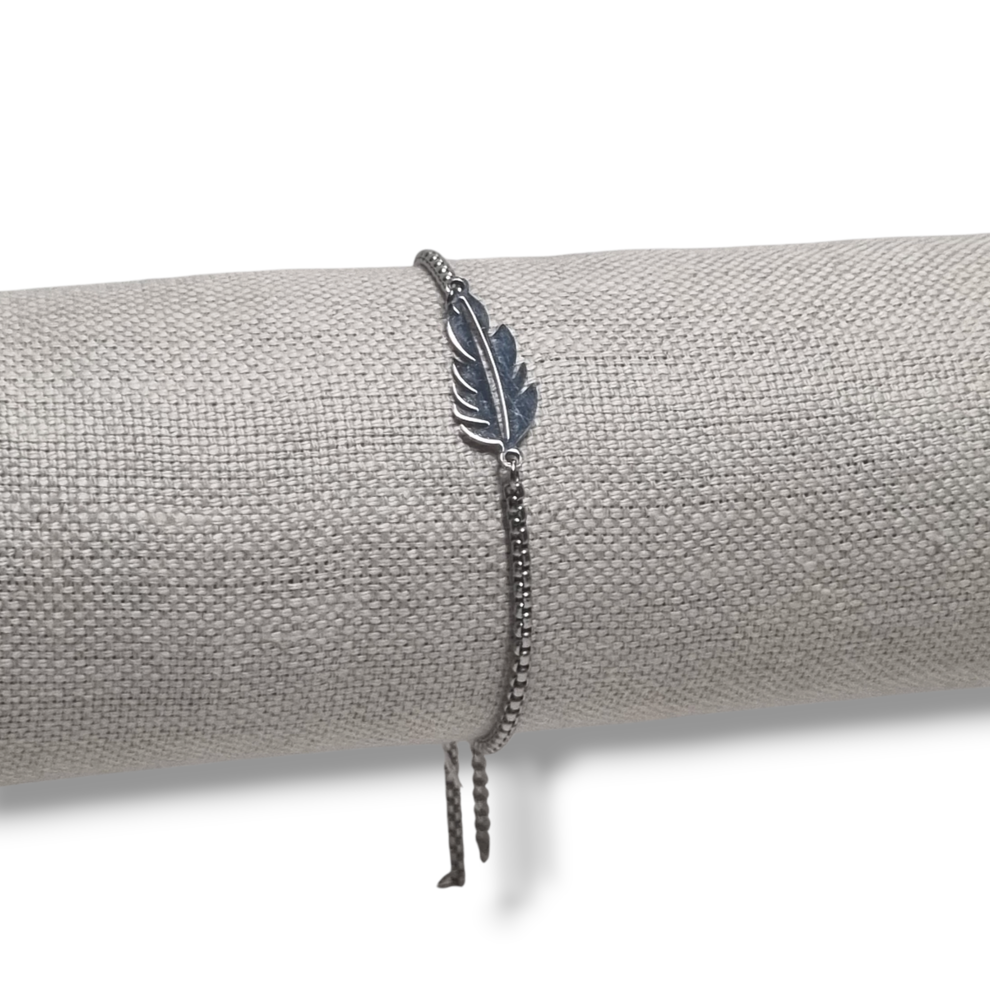 Bracelet plume femme en acier inoxydable disponible en chaîne fine ou lien coulissant. Bijou élégant, léger et symbolique, parfait au quotidien.