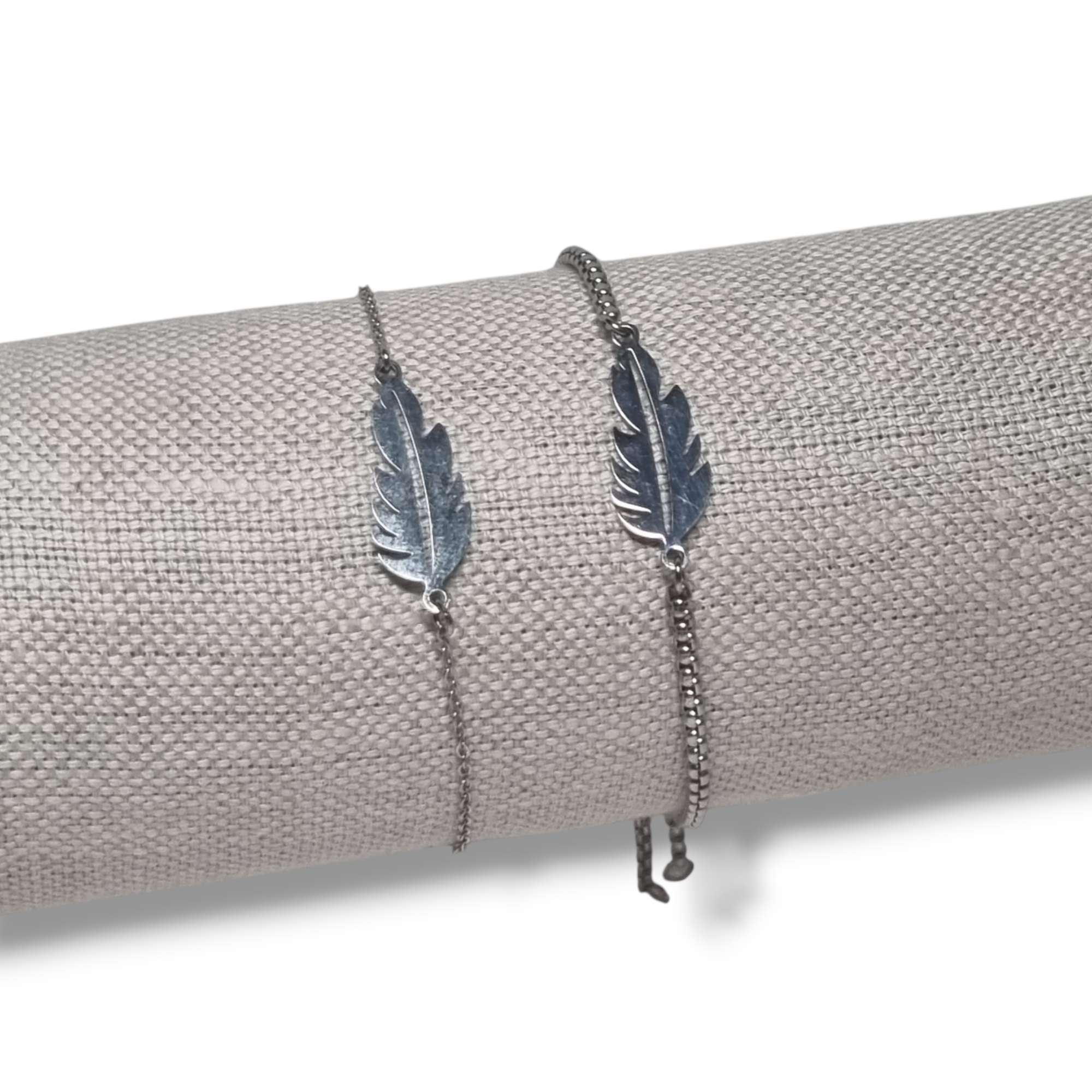 Bracelet avec motif plume en acier inoxydable, disponible en version chaîne ou ajustable, élégant et minimaliste.