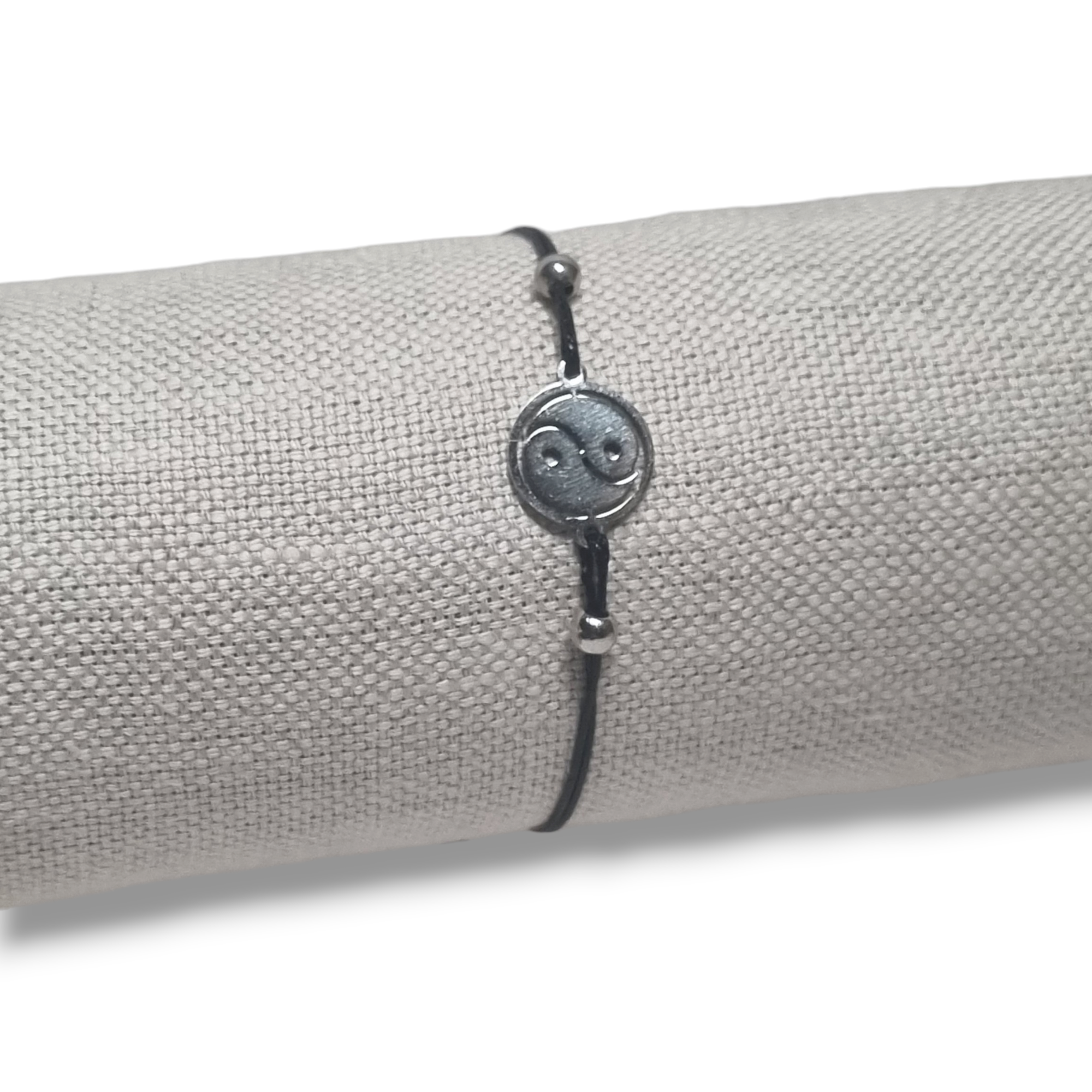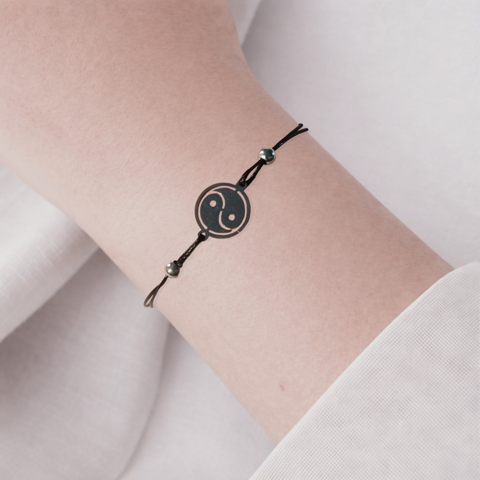 Bracelet avec symbole Yin Yang en acier inoxydable monté sur cordon noir ajustable, représentant l’équilibre et l’harmonie.