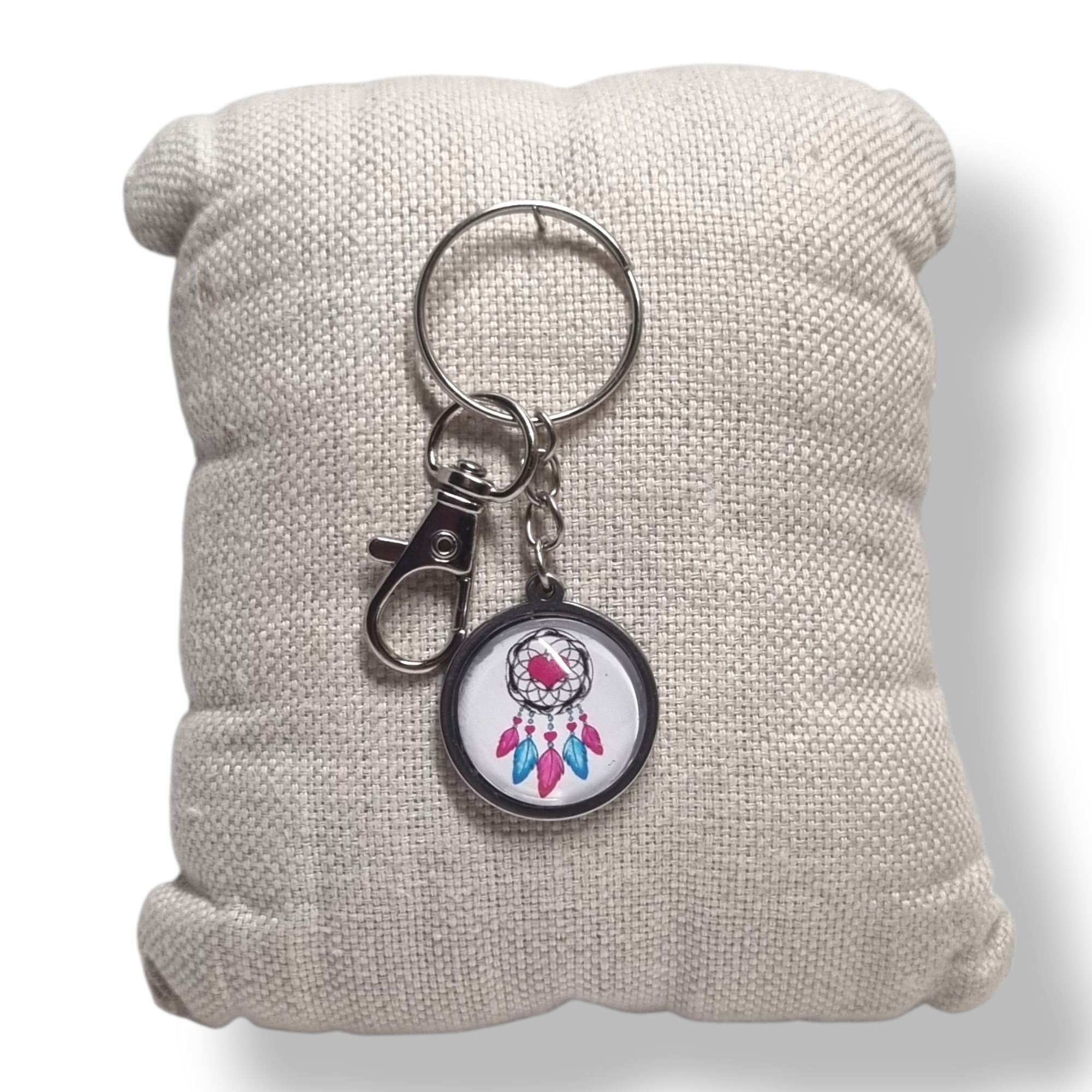• Support : porte-clé en métal • Plateau : acier inoxydable • Finition : cabochon en verre • Motif : Attrape rêve avec cœur