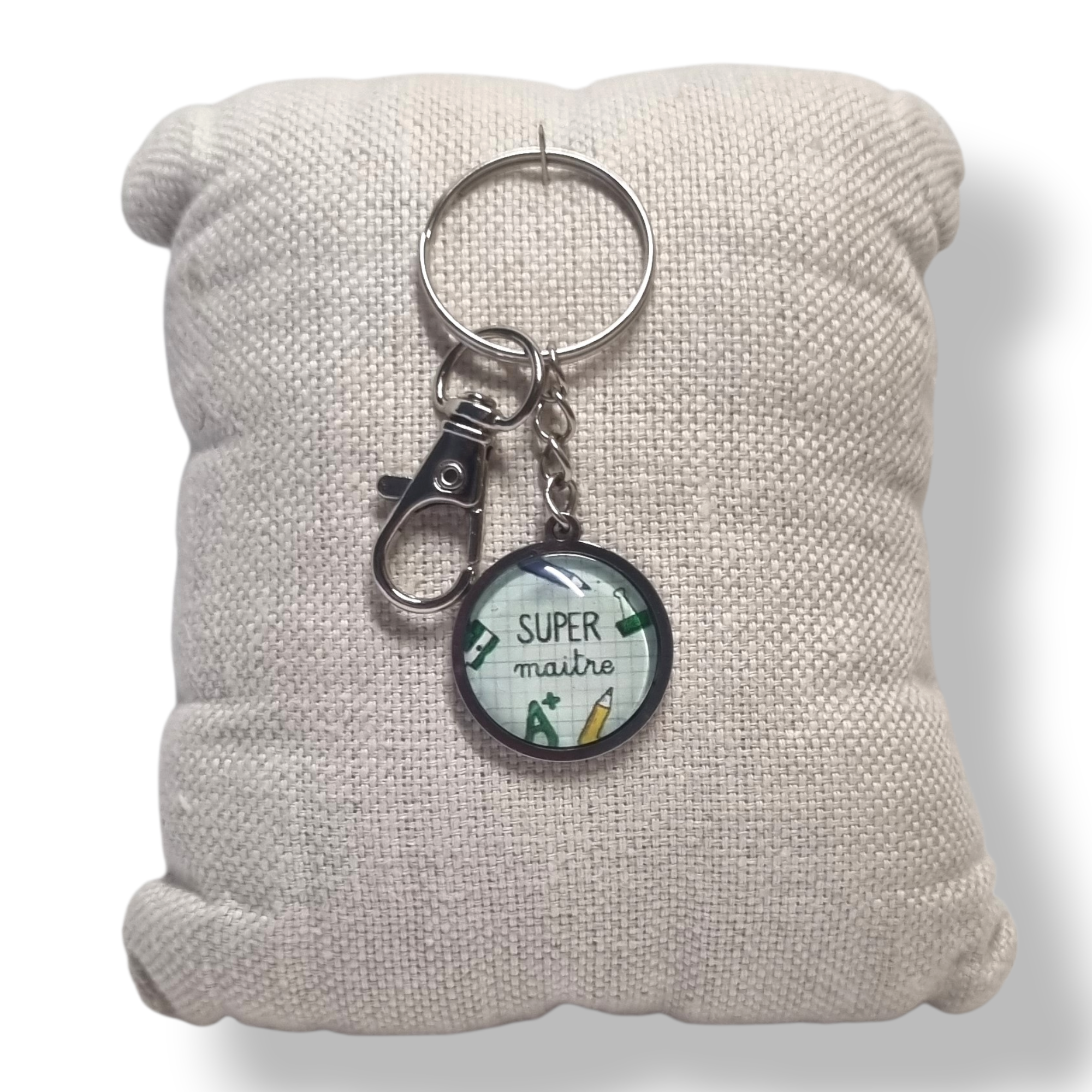 • Support : porte-clé en métal • Plateau : acier inoxydable • Finition : cabochon en verre • Motif : « Super maître »