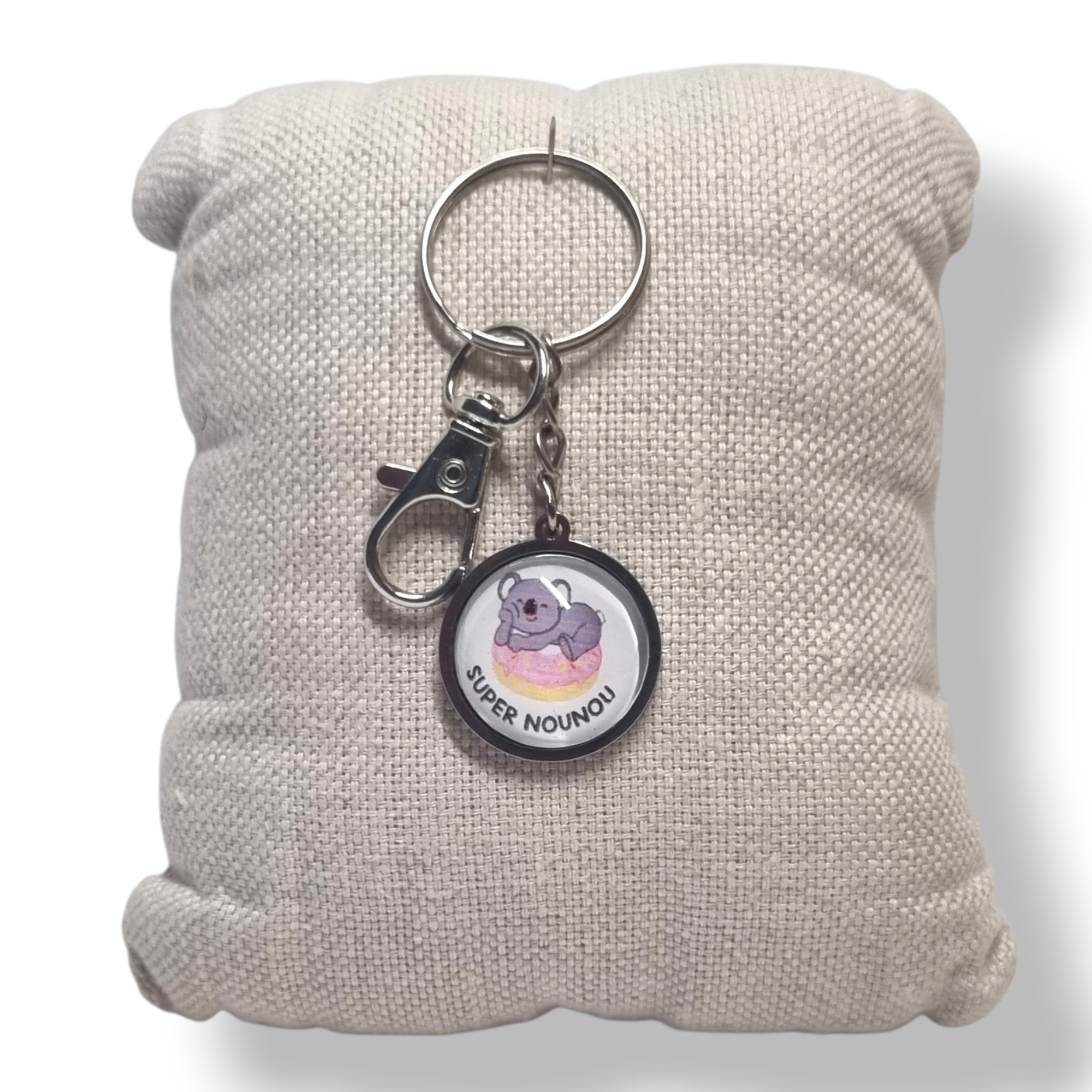 • Support : porte-clé en métal • Plateau : acier inoxydable • Finition : cabochon en verre • Motif : « Super nounou »