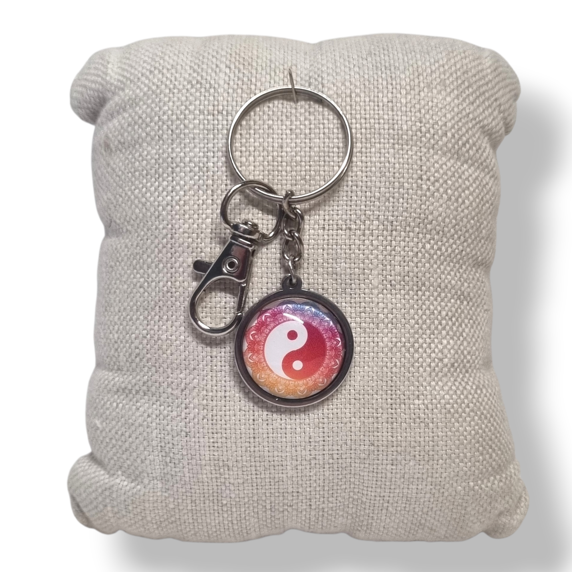 • Support : porte-clé en métal • Plateau : acier inoxydable • Finition : cabochon en verre • Motif : Yin Yang